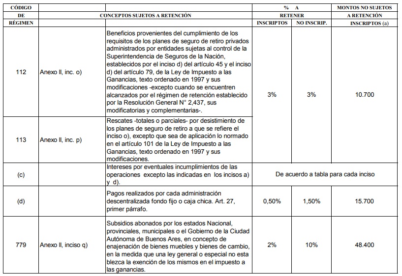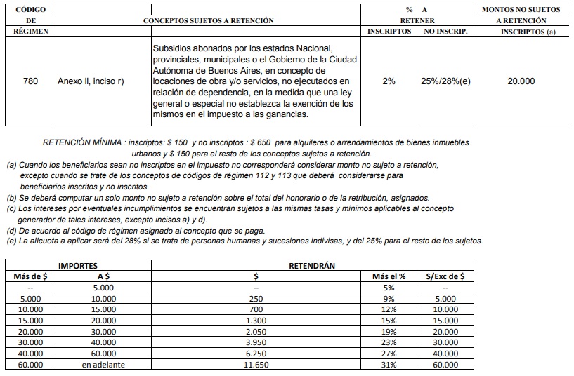 Se incrementan los mínimos y cambia la escala para calcular retenciones de Ganancias Compartir Email Compartir Compartir RESOLUCION GENERAL Nº 4245 - B.O. 16/05/2018 La AFIP elevó los mínimos a partir de los cuales corresponde practicar retenciones por el Impuesto a las Ganancias, y además modificó la escala que se aplica en algunos casos. Vigencia: pagos que se realicen a partir del 1º de Junio. Luego de dos años que no tuvo modificaciones, se modifica la RG Nº 830 (que regula el régimen general de retenciones de Ganancias). Se eleva de $ 90 a $ 150 el importe de la retención mínima, a partir de la cual corresponde retener. Este monto será de $ 650 cuando se trate de alquileres de inmuebles urbanos, cuando el beneficiario no se encuentre inscripto en el impuesto. Finalmente, se modifica el Anexo VIII, elevando los montos no sujetos a retención y la escala, de acuerdo al detalle que adjuntamos al final de este artículo. Vigencia de las presentes modificaciones: para los pagos que se realicen a partir del 1º de Junio de 2018.